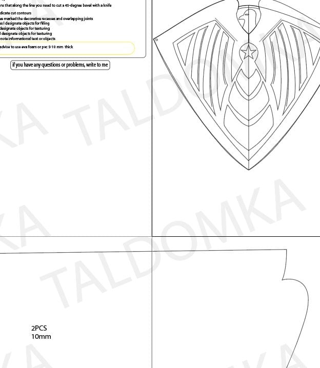 Assembling the shield with this template is simple and intuitive. Simply cut out each piece along the outline, and then connect them using the included instructions. You can also change the size when printing by increasing it in percent.